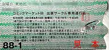 A circle ticket for Comiket 88. The ticket uses holography to prevent counterfeiting and includes the personal information of the exhibitor (blurred in this image) to prevent scalping.