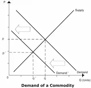 As seen in Figure 3, as the demand for a commodity shifts in (less demand) the quantity decreases to q’. This decreased demand is likely to decrease GDP, as less exporting takes place, as demonstrated by the equation for GDP below.