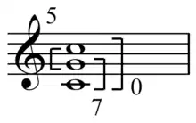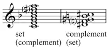As a further example take the chromatic sets 7-1 and 5-1. If the pitch-classes of 7-1 span C–F and those of 5-1 span G–B then they are literal complements. However, if 5-1 spans C–E, C–F, or D–F, then it is an abstract complement of 7-1.[9] As these examples make clear, once sets or pitch-class sets are labeled, "the complement relation is easily recognized by the identical ordinal number in pairs of sets of complementary cardinalities".[3]