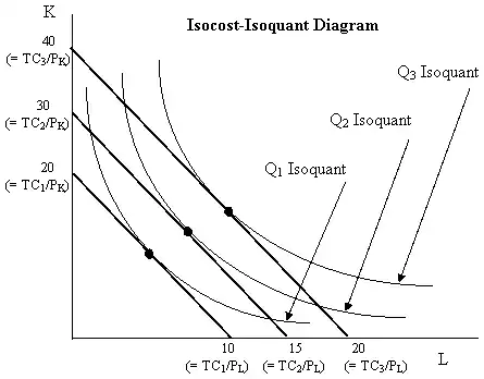 In the simplest mathematical formulation of this problem, two inputs are used (often labor and capital), and the optimization problem seeks to minimize the total cost (amount spent on factors of production, say labor and physical capital) subject to achieving a given level of output, as illustrated in the graph. Each of the convex isoquants shows various combinations of labor and capital usage all of which would allow a given amount of output to be produced. Each straight line segment is an isocost curve showing various amounts of labor and capital whose combined usage would cost a given amount unique to that isocost curve. Conditional on producing the amount of output consistent with, say, the middle isoquant, the lowest cost can be obtained by using amounts of labor and capital such that the point on the given isoquant is on the lowest possible isocost curve—that is, at the point of tangency between the given isoquant and one of the cost curves. At the tangency the marginal rate of technical substitution between the factors (the absolute value of the slope of the isoquant at the optimal point) equals the relative factor costs (the absolute value of the slope of the isocost curve).