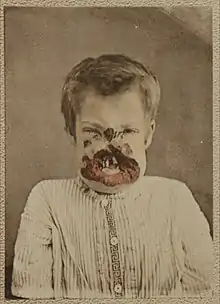 Severe facial disfigurement caused by congenital syphilis, 1880