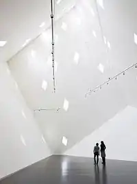Critic Christopher Hawthorne of the Los Angeles Times praised Libeskind for a "careful balance of explosive and well-behaved forms" and gallery designs that abandon the architect's characteristic slanted walls.[2] Likewise, David D'Arcy of The Wall Street Journal sees the museum as a laudable departure from Libeskind's previous work. He finds a "lightness to this [museum] that is rare in the architect's work" and that "relieves the surrounding district's glass and steel tourist-mall monotony."