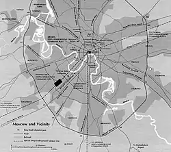 There is also said to be as many as 12 underground levels beneath the Russian capital of Moscow to protect the government in the Kremlin, known as the Main Directorate of special programs of the President (Glavnoye Upravlenie Specialnih Program: GUSP) (ru) the direct successor of the 15th Directorate of the KGB, which was established in 1977, GUSP is said to oversee, amongst other sites, a parallel track line alongside the Moscow metro, known as the 'Kremlin line' Metro-2 or D-6 to be used in an emergency.[16] Two destinations of this system are suggested to be the old KGB headquarters, now the FSB headquarters, at Lubyanka Square, and the second being regarded as an enormous underground leadership bunker adjacent to Moscow State University.[10] Another alleged subterranean destination, apart from the aforementioned underground town at Ramenki/Moscow State University is Vnukovo-2 airport.[17] Despite official Russian state ambiguity, it is speculated that many of the Moscow bunkers are linked by an underground railway line.[12]