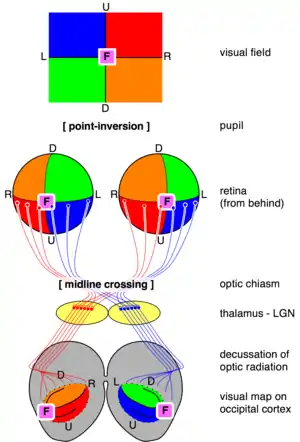 Cajal's schema of the visual map theory. O=Optic chiasm; C=Visual (and motor) cortex; M, S=Decussating pathways; R, G: Sensory nerves, motor ganglia.Transformations of the visual field toward the visual map on the primary visual cortex. U=up; D=down; L=left; R=right; F=foveaThe visual map theory was published by the famous neuroscientist and pioneer Santiago Ramón y Cajal (1898).[17] (See also [18] and [19] for English summaries.) According to this theory, the function of the optic chiasm is to repair the retinal field image on the visual cortex. The pupil in the vertebrates’ eyes inverts the image on the retina, so that the visual periphery projects to the medial side of the retina. By the chiasmatic crossing, the visual periphery is again on the outside, if one assumes that the retinal map is faithfully maintained throughout the optic tract.