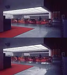 Other real-world architects inspired the game's structures. Carlo Scarpa's work was used heavily in designing stairways that ascended with other parts of the structure, while Tadao Ando's focus on lighting and spiritual spaces were reflected in other parts of the game.[16] Additionally, the design team turned to film for other inspiration. Films of Stanley Kubrick, particularly A Clockwork Orange, as well as films featuring oppressive government agencies, such as The Shape of Water, served as part of the design basis.[16] Other films, like Tinker Tailor Soldier Spy, evoke the concept of repetitiveness, process, and ritualism in these agencies, and that was used to define some of the internal artwork and architecture.[16] Art director Janne Pulkkinen stated they looked at real world churches and other places where ritualism is common, as lighting and design of those spaces are often used to draw attention to specific points of interest.[16]