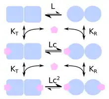 Monod-Wyman-Changeux model reaction scheme of a protein made up of two protomers. The protomer can exist under two states, each with a different affinity for the ligand. L is the ratio of states in the absence of ligand, c is the ratio of affinities.