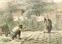 Van Gogh used a photograph of the original painting for this work.[45] Rather than vibrant colors, here he used softer shades of yellow, green and blue. The picture depicts the father, having put down his tools, holding his arms outstretched for his child's first steps. The mother protectively guides the child's movement.[46]