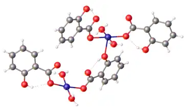 Structure of a hydrated copper(II) salicylate.[1] Color code: red = O, blue = Cu, gray = C, white = H.
