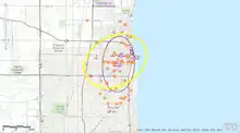 In the early 1990s, crime began to rise in Chicago, Illinois at a significant rate. Many social groups asked the Community Safety Project to analyze relationships between alcohol selling establishments and crime in the city.[12] To analyze data for the city, STAC ellipses were utilized. Location data of establishments with liquor licenses were retrieved from the City of Chicago Department of Revenue. Three types of liquor licenses were utilized: taverns, packaged goods, and incidental consumption.[13] In 1993, there were a total 5,947 liquor licenses, with some establishments holding several. This data was then geocoded to create a pinpoint map of the respected locations. The study period of incidents was a six-month period from January–June 1993. There were 3,364 crime incidents reported to police over this period of time that occurred in or around the liquor establishments. These crimes included property crimes, drug offenses, and misdemeanors, but they were not limited to these categories.[14] This data was also geo-coded into a pinpoint map for analysis.