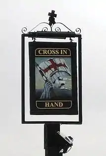 The English Place-Name Society gives the earliest reference to the village as Cruce Manus, the Latin for Cross-in-Hand, recorded in 1547, which by 1597 was being rendered Crosse atte Hand and by 1656 was being called Crosse in the Hande.[3] The name is believed to be based on a legend that Crusaders assembled here before sailing for the Holy Land from Rye to fight Saladin. An alternative explanation is that it is the place where some murderers managed to escape their pursuers by turning to face them with a cross in their hands.[4]
