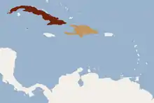 Cuban fig-eating bats are found across Cuba and neighbouring smaller islands, on Hispaniola (in Haiti and the Dominican Republic), and the Cayman Islands. A vagrant has been reported from the Florida Keys.[1] They inhabit forested and parkland habitats from sea level to 680 m (2,230 ft), including both evergreen and deciduous woodlands.[2]