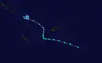 On January 27, a shallow tropical depression formed within the South Pacific Convergence Zone, about 430 km (265 mi) to the southeast of Funafuti, Tuvalu.[8] Over the next two days the system developed little and remained slow moving, near the Tuvaluan atoll of Funafuti.[8] During January 30, the depression moved towards the north-east and started to organize, as pressures near the systems center rapidly falling.[8] During the next day the system subsequently started to curve south-eastwards and away from Tuvalu, before the NWOC initiated advisories on the system and designated it as Tropical Cyclone 13P.[9][10] Late on January 31, TCWC Nadi named the tropical depression Ofa, after it had developed into a category 1 tropical cyclone on the Australian scale.[9][2] Over the few days the system moved towards the south-southeast and intensified further. Ofa subsequently passed about 110 km (70 mi) to the west of the Western Samoan Island of Savai'i between 10:00 and 18:00 UTC during February 3.[9] Early the next day as the system started to accelerate towards the south-southeast towards the island nation of Niue, the NWOC estimated that Ofa had peaked with 1-minute sustained wind speeds of 215 km/h (130 mph), which made it equivalent to a category 4 hurricane on the SSHWS.[11] Later that day TCWC Nadi also estimated that the system had peaked with 10-minute sustained wind speeds of 185 km/h (115 mph) as a category 4 severe tropical cyclone,.[2] During February 5, the system passed about 55 km (35 mi) to the west of Niue, as it started to weaken and started to transition into an extratropical cyclone.[7][9] The system completed this transition during February 8, before the remnants were last noted during February 10 after they had performed a small clockwise loop.[7]