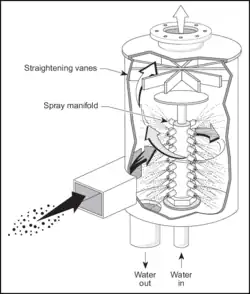 Generally, the inlet gas enters the chamber tangentially, swirls through the chamber in a corkscrew motion, and exits. At the same time, liquid is sprayed inside the chamber. As the gas swirls around the chamber, pollutants are removed when they impact on liquid droplets, are thrown to the walls, and washed back down and out.