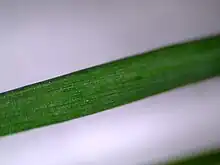 Leaves are pointed at the tip, flat (not boat-shaped). The lower side of the leaf is smooth, glossy and keeled. The upper side is ribbed. Other grasses with glossy leaves include Lolium perenne and Poa trivialis.