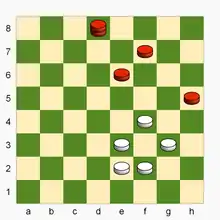 - ↑ White wins with 1. c1e3 a5:c5 2. e1c3. Black is now obligated to capture the maximum number of men (four) with the multi-jump 2... c5:c1:h1:h3:d3 and must stop on d3, since the jumped men on c3 and d1 remain on the board until the multi-jump has been completed (the already-jumped man on c3 may not be jumped more than once, and the jumped man on d1 prevents Black from jumping the man on d2). The captured men are now removed, and White proceeds with the multi-jump 3. d2:d4:d6:b6:b8+.