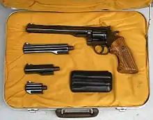 The Model 44 or Large Frame Dan Wesson was initially offered with 4", 6", 8", or 10" interchangeable barrel/shroud options,[6] and most guns shipped with a 6-inch barrel. A 2 1/2" barrel/shroud was later introduced, available as a separate option from the factory. Like the Model 15-2, the Model 44 could also be purchased with a variety of shroud configurations – either partial lug or full lug with a solid rib or ventilated-rib barrel. The Model 44 could also be obtained with a "Power Control" barrel compensator.[9] This was a stainless steel barrel drilled radially at the muzzle end with a series of small ports. Two small vents cut into the top of the barrel shroud vented excess gas and reduced apparent recoil of the gun, although this feature eliminated the option of using cast lead bullets due to lead and carbon accumulation. At the time, Dan Wesson M44 was the lightest recoiling .44 magnum ever produced.[2][7] Light recoil was a side benefit in IHMSA silhouette competitions. The Model 44's high level of intrinsic accuracy, combined with an excellent trigger, and fast lock time, caused a surge in popularity of the M44 in heavy-caliber revolver competition, though the gun was also popular with handgun hunters and sportsmen who desired a gun for personal protection against bears or other large predators. The Power Control barrel and vented shroud were eventually dropped, though DW did experiment with an external shroud-mounted compensator in later models.