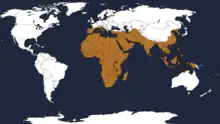 The plain tiger is found across the entirety of Africa, where the predominant subspecies is D. c. alcippus. Its range extends across the majority of Asia throughout Indian subcontinent,[1] as well as many south Pacific islands. The plain tiger is even present in parts of Australia.[4] D. c. chrysippus is most common throughout Asia and in some select regions in Africa, while D. c. orientis is present in more tropical African regions as well as some African islands, including Madagascar and the Seychelles.[6][2] It is also found in Southern Europe and Kuwait. These insects are considered bioinvaders in North America.