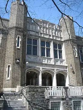 Originally existed in 1912 as Riverdale Branch Technical School, the building has been added to many times since it was founded in 1923,[2] and there are sections of the school built in almost every decade of the twentieth century. Danforth has a maze-like basement. At least one basement level is permanently sealed to students creating a number of rumours about what might be down there (including a connection to the subway that runs under the school, a rifle range, and a bomb shelter). The sub-basement does in fact host the school's active Cadet Corps and National Defence course. According to the current principal the range is still mostly intact. The school has three gyms, which is remarkable in a Toronto public school, and a large 1920s auditorium which is occasionally used in films. Additional facilities include a weight room, and a swimming pool. The main school façade is Collegiate Gothic was designed by architect C.E. Cyril Dyson.[3]