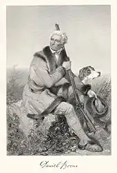 Although Boone reportedly vowed never to return to Kentucky after moving to Missouri, stories (possibly folk tales) were told of him making one last visit to Kentucky to pay off his creditors.[109] American painter John James Audubon claimed to have gone hunting with Boone in Kentucky around 1810. Years later, Audubon painted a portrait of Boone, supposedly from memory, although skeptics noted the similarity of his painting to the well-known portraits by Chester Harding.[110][111] Some historians believe Boone visited his brother Squire near Kentucky in 1810 and have accepted the veracity of Audubon's account.[112][113][note 6]