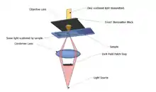 In optical microscopy, dark-field describes an illumination technique used to enhance the contrast in unstained samples. It works by illuminating the sample with light that will not be collected by the objective lens and thus will not form part of the image. This produces the classic appearance of a dark, almost black, background with bright objects on it.