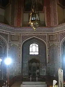 The mausoleum of Shaikh Daud Bandagi Kirmani in Shergarh, Punjab is an example of early Mughal architecture. The architect of the mausoleum, completed in AD 1580, was Ustad Baazid. His description of designing and building the shrine is extant in the 17th century hagiography of the saint, Maqamat-e-Daudi. The interior of the Husht Phelo (Octagonal) shrine is decorated with intricate Naqashi (floral and geometric wall frescoes). The eight interior alcoves and panels of the shrine are embellished with different naqashi patterns suggesting the unique signature work or style of the artists and artisans who with immense spiritual devotion built and decorated the shrine more than four centuries ago. On each of the eight interior lower alcoves are Persian couplets by Shah Abul Muali extolling the virtues of the saint. The grave of Daud Bandagi is in an enclosure located in the center of the shrine with the graves of six of his lineal descendants (Sajjada Nashin's) on either side. The exterior of the shrine has panels of intricate stucco tracery Manabat Kari on all sides including the outer alcoves. The shrine, today, is under the care of the Auqaf Department and the Archeology Department of the Government of Punjab, Pakistan. In the 1980s extensive restoration work was done on the mausoleum by the Archeology Department. The work inside the shrine was mainly on the preservation of the Naqashi frescoes.[2][3]