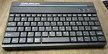 In February 1993,[13] Dauphin unveiled the DTR-1 (an abbreviation of Desktop Replacement-1), a touchscreen palmtop PC weighing 2.5 pounds (1.1 kg), measuring 9 by 5 by 1.5 inches (22.9 by 12.7 by 3.8 cm),[14]: 39 and running Cyrix's Cx486SLC microprocessor and Microsoft's Windows for Pen Computing operating system.[14]: 37 The DTR-1 can be used as a more standard subnotebook by placing it within its carrying case, which also houses the computer's included keyboard, or it can be used like a PDA sans keyboard.[14]: 39 IBM signed a contract with Dauphin to manufacture the DTR-1 in unused production facilities in Austin, Texas, in May 1993.[15][16][17] Hewlett-Packard provided the DTR-1's hard disk drive, which were Kittyhawk microdrive units measuring 1.3 inches in diameter (as opposed to the 2.5-inch diameter drives used in most laptops of the time).[18] The DTR-1 was released in mid-1993 to tepid sales and mixed reviews from technology journalists,[19][20] who complimented its small stature but found the hardware underpowered and the small keyboard cumbersome to use.[21][22]