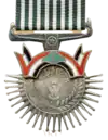 The Medal of the Alliance consists of two classes medal.The first layer consists of a background of black and green colours. the second layer consists of a five-pointed star representing the five categories of the People's Working Forces Alliance. In the centre of the star is the emblem of the Republic on white ground. The emblem is surrounded by a red ring, symbolising national unity within the People's Working Forces Alliance framework. Five groups consisting of five rays emerge from the heads of the star. The decoration hangs from a ribbon of one colour, green.[5] |