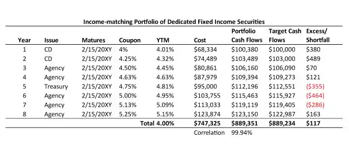 Recall that a secondary goal of dedicated portfolio theory is to select the bonds that will provide the requisite cash flows at the lowest possible cost, given requirements on the minimum quality of bonds to be considered (thus the need for calculation). In this fictitious example, the cost shown is $747,325 to purchase this initial set of bonds, excluding transaction costs and fees, but the actual cost would vary depending on yields, quality of bonds used, and length of the time horizon. It would also depend on the starting time for the cash flows. If this couple planned to retire in five years, they could defer the starting time to coincide with their retirement date. They would buy a dedicated portfolio whose first bond matured in five years, the second in six years, etc. Yields would likely be higher on these bonds because they are further out on the yield curve.