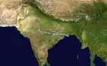 A low pressure area persisted over the northern Bay of Bengal on July 22, eventually organizing into a depression on July 25 about 160 km (99 mi) south of Kolkata. Moving northwestward, the system quickly intensified into a deep depression,[1] with peak winds estimated at 55 km/h (35 mph). Late on July 25, the system made landfall north of Balasore in Odisha state.[18] It progressed inland across India, weakening to depression status but remaining a distinct system. On July 28, the depression degenerated into a remnant low over Rajasthan in northwestern India, later merging with a heat low. Rainfall associated with the system mostly occurred in the southwestern periphery, with a peak of 250 mm (9.8 in) at Kendrapara; there was little damage.[1] Rainfall also spread into Bangladesh.[2]