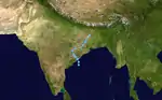 A low-pressure area persisted on October 4 in the western Bay of Bengal, off the east coast of Tamil Nadu. Two days later, the system organized into a depression and moved northward. Early on October 7, the depression made landfall at Kalingapatnam, Andhra Pradesh. After moving slowly northwestward over land, the system turned to the northeast, degenerating into a remnant low on October 10 over West Bengal.[1] The depression dropped heavy rainfall along its path, peaking at 380 mm (15 in) in Chandabali, Odisha. Kolkata received 267 mm (10.5 in), and rainfall spread as far northeast as Assam.[20] The rains caused widespread flooding across southeastern India, inundating 20 villages and covering 16,000 hectares (39,000 acres) of rice paddies. A tornado spawned by the depression injured 11 people and damaged several houses in Murshidabad. Across its track, the depression killed 13 people in West Bengal and another eight in Andhra Pradesh.[1]