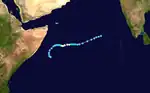 The lone system in the Arabian Sea in the season originated from a trough.[1] On November 10, an area of convection formed off the western coast of India. With little wind shear, the system organized further as it moved west-southwestward due to a ridge to the north.[21] On November 12, the system developed into a depression and quickly intensified into a deep depression.[1] That day, the JTWC classified the system as Tropical Cyclone 02A,[21] and it intensified into a cyclonic storm on November 13.[1] The storm was located at an unusually low latitude of 6° N.[2] After an eye developed in the center of the convection, the JTWC upgraded the storm to the equivalent of a minimal hurricane,[21] estimating peak winds of 150 km/h (95 mph) on November 14. By contrast, the IMD estimated peak winds of 100 km/h (60 mph),[22] making the system a severe cyclonic storm.[1] Subsequently, drier air weakened the storm, causing the convection to decrease.[21] By November 15, the storm had weakened to depression status while approaching Somalia.[1] That day, the JTWC discontinued advisories while the storm was about 520 km (320 mi) east of the Somalia coastline.[21] On November 16, the depression degenerated into a remnant low, and subsequently dissipated.[1]