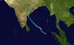 On December 10, an area of convection with an associated circulation persisted about 740 km (460 mi) west of the northern tip of Sumatra, as part of a trough in the region and enhanced by the monsoon. A steady decline in the wind shear allowed the thunderstorms to organize,[23] and a depression formed on December 11.[1] On the next day, the JTWC initiated advisories on Tropical Cyclone 03B. The storm moved generally northwestward, steered by a ridge to the north.[23] The IMD upgraded the system to a deep depression and later cyclonic storm on December 13, and further to a severe cyclonic storm a day later. The agency estimated peak winds of 100 km/h (60 mph), noting spiral convection organizing around the beginnings of an eye feature.[1] The storm also developed well-defined outflow due to an approaching trough from the west. At around 14:30 UTC on December 15, the storm made landfall near False Divi Point in southeastern India,[23] along the coast of Andhra Pradesh. After turning to the northeast over land, the system rapidly weakened, degenerating into a remnant low on December 16.[1]