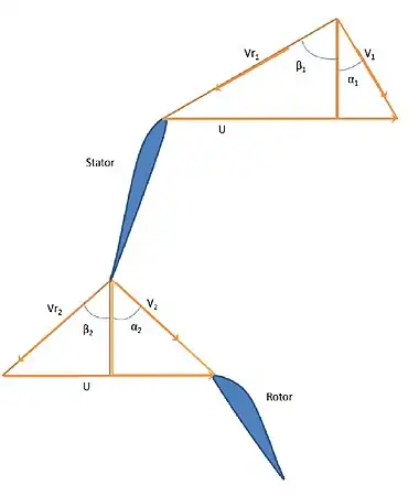 Where 1 to 3ss in Figure 1 represents the isentropic process beginning from stator inlet at 1 to rotor outlet at 3. And 2 to 3s is the isentropic process from rotor inlet at 2 to rotor outlet at 3. The velocity triangle[2] (Figure 2.) for the flow process within the stage represents the change in fluid velocity as it flows first in the stator or the fixed blades and then through the rotor or the moving blades. Due to the change in velocities there is a corresponding pressure change.