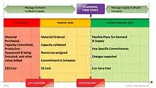 The demand control process requires that all functions agree on time fences within the planning horizon, which should be no less than a rolling 24 months based on integrated business planning best practices.[5] A time fence is a decision point within a manufacturer's planning horizon. Typically, three established time fences exist within a company: