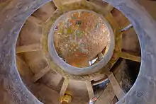 The tower rises as an open shaft lined by circular balconies overlooking the central space. Access from balcony to balcony is provided by small stairways. At the top the space is decked over, creating an enclosed observation level with large glazed windows. An open observation area on the roof of this space is now closed to visitors and is used for radio equipment. The steel and concrete structure of the observation level is concealed behind plaster, stone and wood. The tower is decorated by bold murals by Fred Kabotie, with other, petroglyph-style decorations by Fred Geary. Small windows in the tower's shaft let beams of light into the lower space.[4] The tower also features a number of "reflectoscopes" – black mirrors to reflect the view of the canyon in a more abstract style, providing visitors an alternative view of the Canyon.[6]
