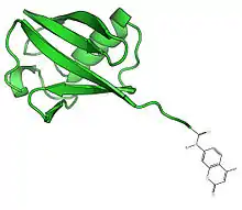 USP21 (blue) covalently linked to linear diubiquitin aldehyde (green). The C-terminus of the ubiquitin protrudes through the active site of USP21 (lower right).