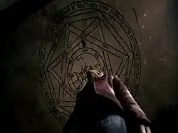 ![]() The demonically-possessed Meg Masters is caught beneath the titular devil's trap. | |