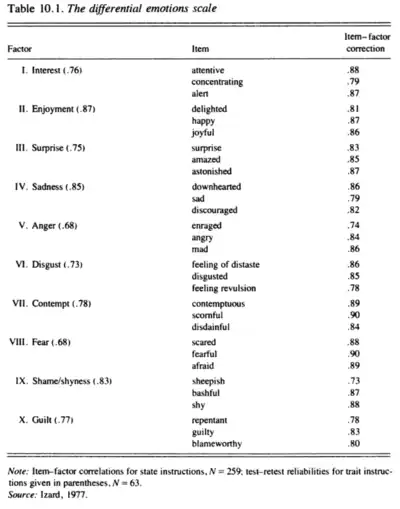 The Differential Emotions Scale (DES) (Izard, 1997s) is a multidimensional self-report device for assessment of an individual's emotions (whether fundamental emotions or patterns of emotions).[2] The DES helps measure mood based on Carroll Izard's differential emotions theory, [3] The DES consists of thirty items, three for each of the ten fundamental emotions as visualized by Izard: interest, joy, surprise, sadness, anger, disgust, contempt, fear, shame/ shyness, and guilt, which are represented on 5-point Likert scale.[4] There are currently four different versions of the scale. Despite the different versions, the basic idea of are very similar. Participants are asked to rate each of the emotions on a scale, and depending on the instructions given, they either rate their current feelings, feelings over the past week, or over long-term traits (i.e. how often do you feel this emotion in your day-to-day living).[5] The DES is similar to other scales such as the Multiple Affect Adjective Check List (MAACL) and the Multiple Affect Adjective Check List-Revised (MAACL-R) which are used to assess either the state or trait affect by varying the time of which instructions are given to the participants.[3]