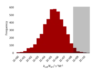 Kinetically perfect enzymes have a specificity constant, kcat/Km, on the order of 108 to 109 M−1 s−1. The rate of the enzyme-catalysed reaction is limited by diffusion and so the enzyme 'processes' the substrate well before it encounters another molecule.[1]