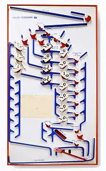 The Digi-Comp II was a toy computer invented by John "Jack" Thomas Godfrey (1924–2009)[1][2] in 1965[1] and manufactured by E.S.R., Inc. in the late 1960s, that used 1⁄2 inch (12.5 mm) marbles rolling down a ramp to perform basic calculations.