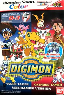Digimon: Anode/Cathode Tamer is one of two Digimon WonderSwan[1] games (and one of the very few WonderSwan Color games) that are available in English. It combines two separate Japanese games, Digimon Adventure: Anode Tamer (デジモンアドベンチャー アノードテイマー), and Digimon Adventure: Cathode Tamer (デジモンアドベンチャー カソードテイマー), into one. The game was distributed by Bandai Asia and targeted mostly to Hong Kong and possibly several other English-speaking Asian markets. The name is derived from the two different electrodes anode and cathode.
