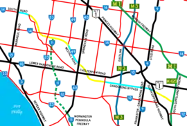Construction of the Dingley Bypass began in 2014 and was completed in March 2016, 5 months ahead of schedule.[2] The $156 Million, 6.4 kilometre Dingley Bypass was completed five months ahead of schedule and was opened on 11 March 2016 by Minister for Roads, Luke Donnellan. A divided highway with 3 lanes in each direction, it is expected to carry 35,000 vehicles each day. A new 5.2 kilometre bike path also runs beside the Bypass and extends from the existing bike path at Old Dandenong Road and provides vital links to Victoria's greater bicycle network.[3]