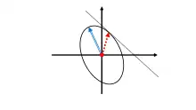 - The red dotted-line arrow shows the first DCA pattern, which points towards the point at which the diagonal line is tangent to the ellipse