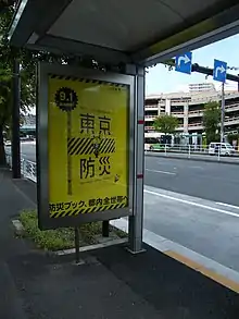 A bus stop in Shinonome, Tokyo, with a poster for Disaster Prevention Day in September 2015