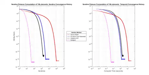 Poisson convergence of various iterative methods with infinity norms of residuals against iteration count and computer time.