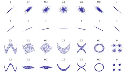 Then for every , and are independent if and only if . It is important to note that this characterization does not hold for exponent ; in this case for bivariate , is a deterministic function of the Pearson correlation.[2] If and are powers of the corresponding distances, , then sample distance covariance can be defined as the nonnegative number for which