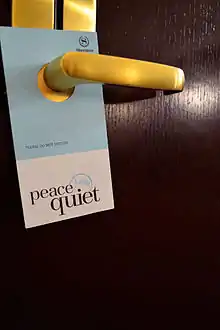 One common place where do not disturb signs are used is in places of lodging, where guests can place these signs on the door in order to inform staff, including housekeeping, to respect their privacy.[1] Some hotels also provide "make up room" signs giving the opposite instructions.