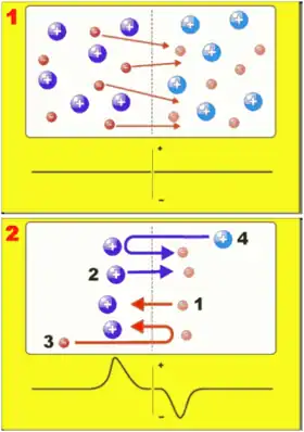 Double layer formation. Formation of a double layer requires electrons to move between two adjacent regions (Diagram 1, top) causing a charge separation. An electrostatic potential imbalance may result (Diagram 2, bottom)