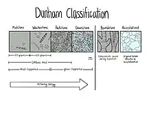 | Modified Dunham Classification (Dunham, 1962;[1] Embry and Klovan, 1971[2]) | |||||||||