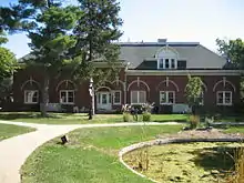 The Dwight Veterans' Administration Hospital occupied the triangular-shaped block between Main Street, Mazon Avenue, and Prairie Avenue. Part of the facility was built in 1891 for the Keeley Institute.[36] In 1930 it became the Dwight V.A. Hospital, and an addition opened on May 11, 1947, with a modern surgical suite, wards, clinic, and physical therapy facilities.[37] The buildings survive and are partially occupied by the Fox Developmental Center.